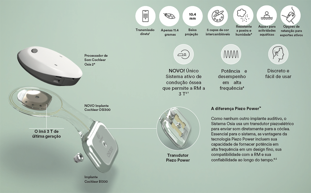 O Sistema Cochlear™ Osia®, composto pelo Implante Cochlear Osia OSI200, o Implante Cochlear BI300 e o Processador de Som Cochlear Osia 2, é um sistema de implante auditivo ativo de condução óssea projetado para proporcionar excelente desempenho auditivo.